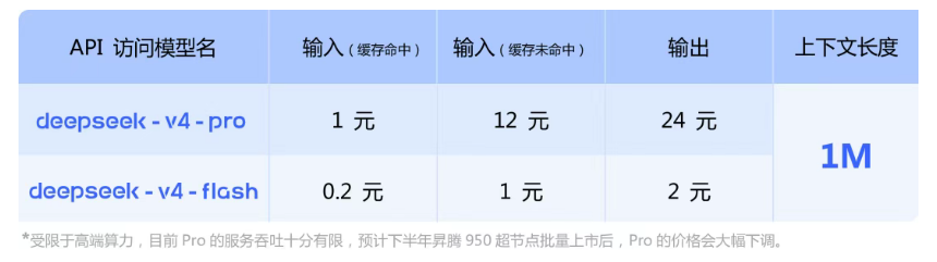 4月24日,DeepSeek全新系列模型DeepSeek-V4的预览版本正式上线并同步开源,包括deepseek-v4-pro和deepseek-v4-flash。DeepSeek表示,受限于高端算力停牌复牌,目前Pro模型的服务吞吐十分有限,预计下半年昇腾950超节点批量上市后,Pro的价格会大幅下调。